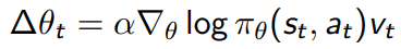 - REINFORCE 알고리즘 (여러 에피소드를 거쳐 update하므로 policy gradient의 기댓값 제거)
